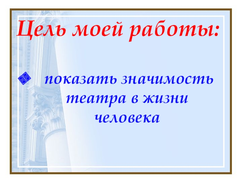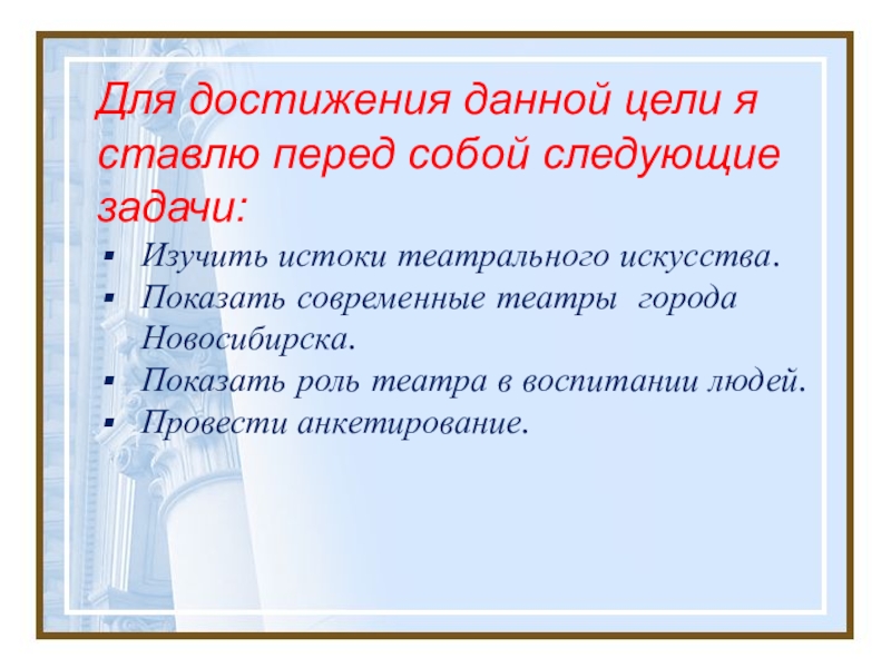Для достижения данной цели я ставлю перед собой следующие задачи:Изучить истоки театрального искусства.Показать современные театры города Новосибирска.Показать