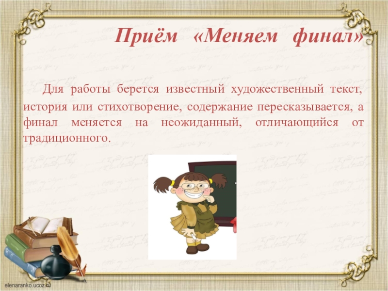 художественный текст, история или стихотворение, содержание пересказывается, а финал меняется на неожиданный, отличающийся от традиционного.