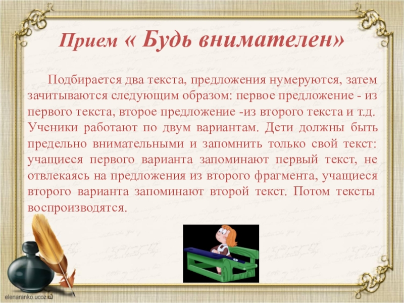 образом: первое предложение - из первого текста, второе предложение -из второго текста и т.д. Ученики работают по двум вариантам. Дети должны быть предельно внимательными и запомнить только свой текст: учащиеся первого варианта запоминают первый текст, не отвлекаясь на предложения из второго фрагмента, учащиеся второго варианта запоминают второй текст. Потом тексты воспроизводятся.