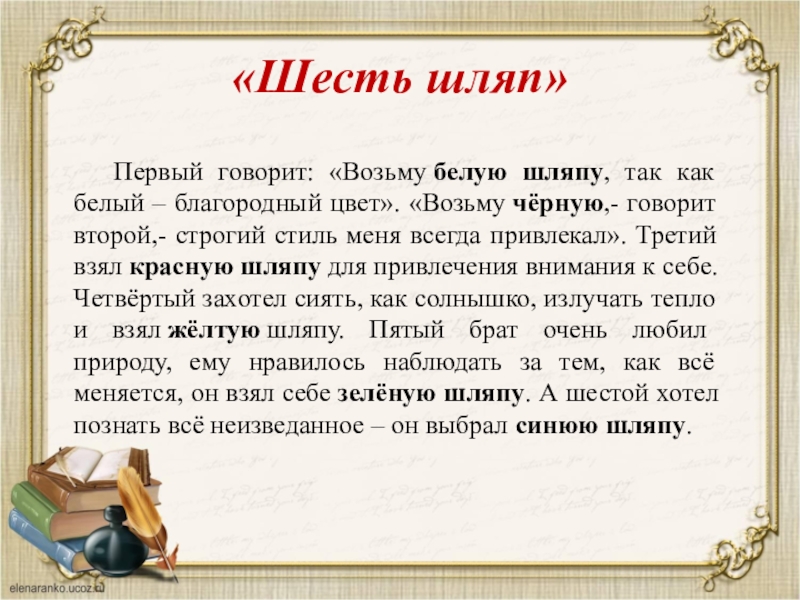 «Возьму чёрную,- говорит второй,- строгий стиль меня всегда привлекал». Третий взял красную шляпу для привлечения внимания к себе. Четвёртый захотел сиять, как солнышко, излучать тепло и взял жёлтую шляпу. Пятый брат очень любил природу, ему нравилось наблюдать за тем, как всё меняется, он взял себе зелёную шляпу. А шестой хотел познать всё неизведанное – он выбрал синюю шляпу.