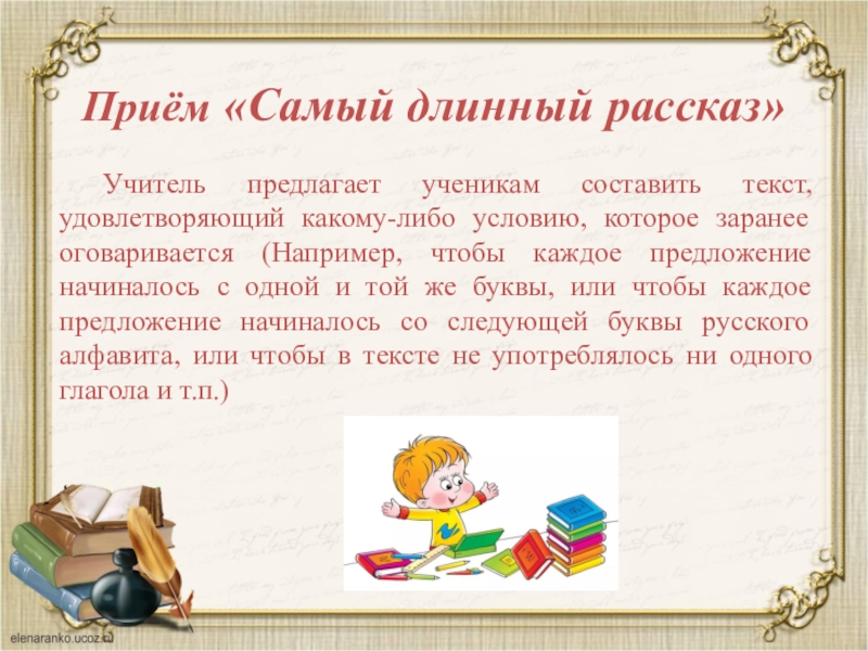 повторяет её и сочиняет своё предложение, подходящее по тематике. Уже третий ученик повторяет два предложения (учителя и предыдущего ученика) и составляет своё. Текст растёт, как снежный ком.