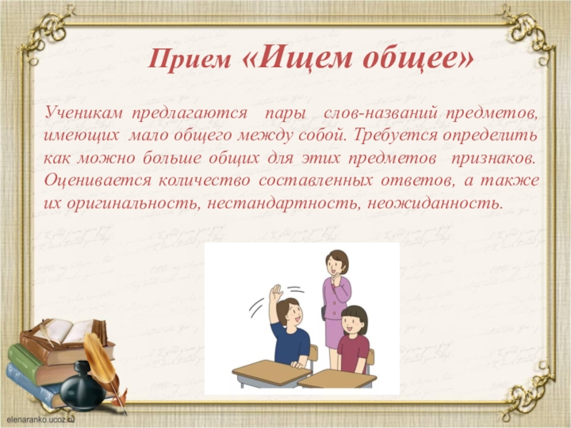 имеющих мало общего между собой. Требуется определить как можно больше общих для этих предметов признаков. Оценивается количество составленных ответов, а также их оригинальность, нестандартность, неожиданность.