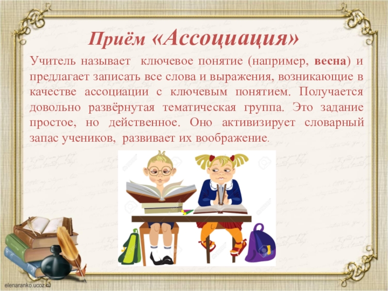 слова и выражения, возникающие в качестве ассоциации с ключевым понятием. Получается довольно развёрнутая тематическая группа. Это задание простое, но действенное. Оно активизирует словарный запас учеников, развивает их воображение.