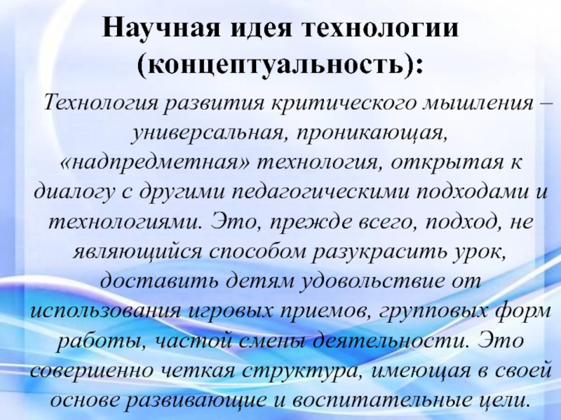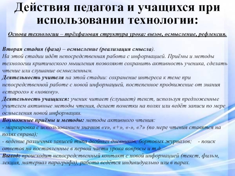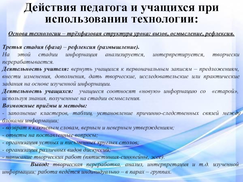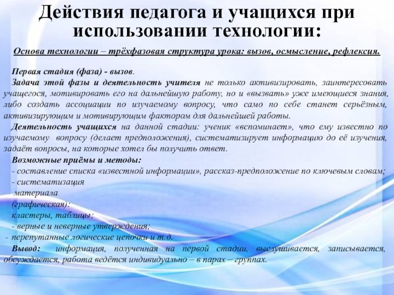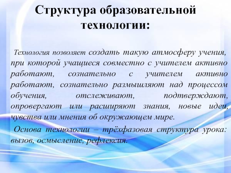 Основа технологии – трёхфазовая структура урока: вызов, осмысление, рефлексия.
