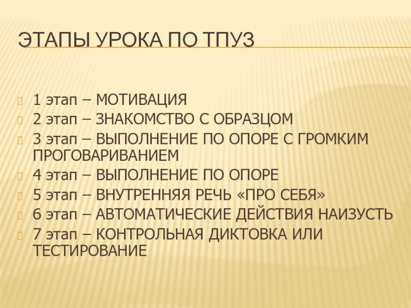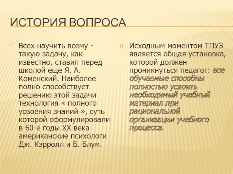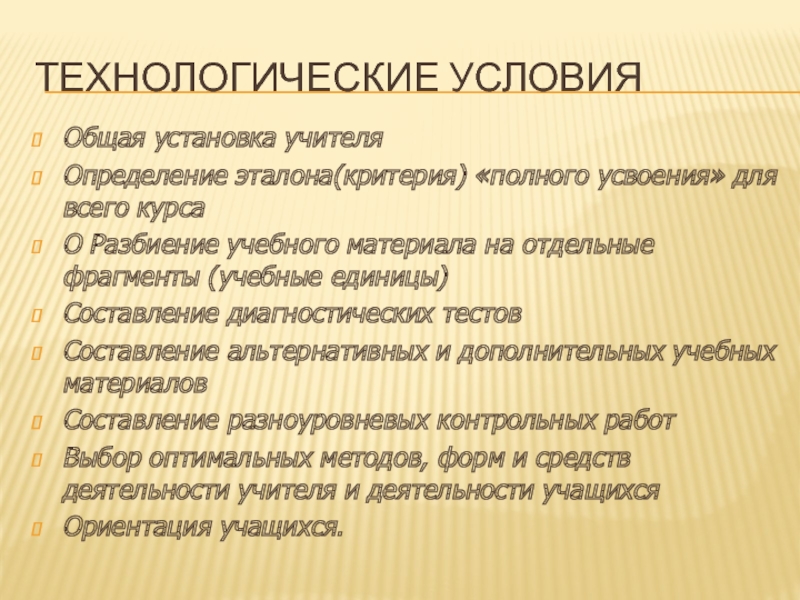 Исходным моментом ТПУЗ является общая установка, которой должен проникнуться педагог: все обучаемые способны полностью усвоить необходимый учебный материал при рациональной организации учебного процесса.