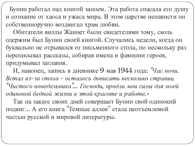 Слайд 8 Бунин работал над книгой запоем. Эта работа спасала его душу и