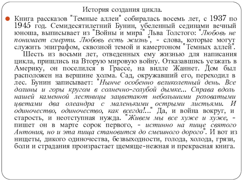 по 1945 год. Семидесятилетний Бунин, убеленный сединами вечный юноша, выписывает из "Войны и мира" Льва Толстого: "Любовь не понимает смерти. Любовь есть жизнь", - слова, которые могут служить эпиграфом, сквозной темой и камертоном "Темных аллей".