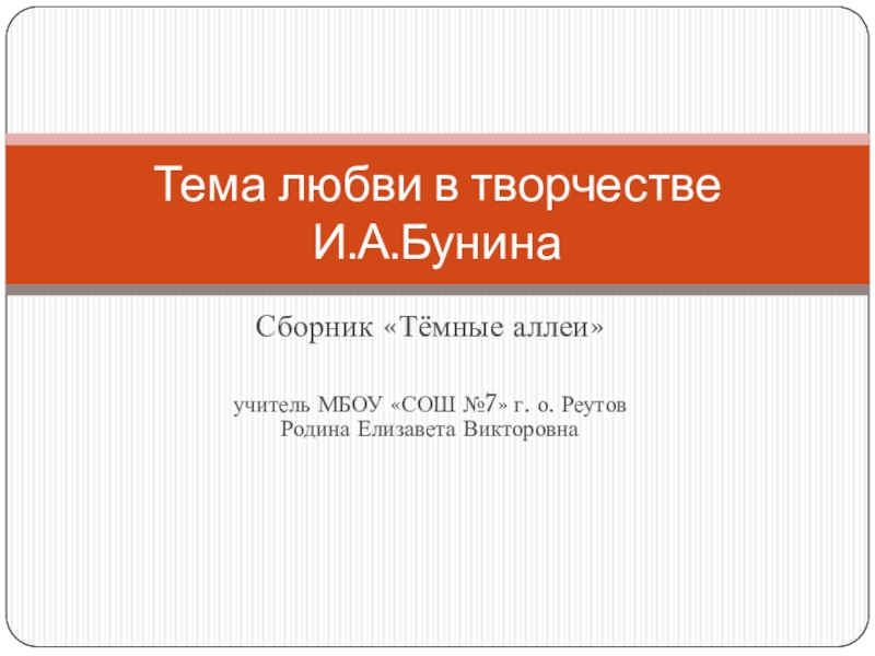 его земное существование. Мало кто из писателей и поэтов обошёл вниманием эту тему. Наверное чаще других обращался к ней И.А.Бунин, который утверждал, что «всякая любовь – великое счастье…».Сборник рассказов «Тёмные аллеи» – шедевр позднего периода творчества писателя. Рассказы этого цикла объединены общей темой, авторским мироощущением, эмоциональной окраской, композиционными приёмами, стилистикой.