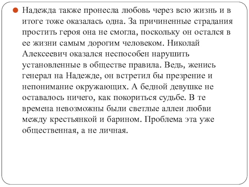 оказалась одна. За причиненные страдания простить героя она не смогла, поскольку он остался в ее жизни самым дорогим человеком. Николай Алексеевич оказался неспособен нарушить установленные в обществе правила. Ведь, женись генерал на Надежде, он встретил бы презрение и непонимание окружающих. А бедной девушке не оставалось ничего, как покориться судьбе. В те времена невозможны были светлые аллеи любви между крестьянкой и барином. Проблема эта уже общественная, а не личная.