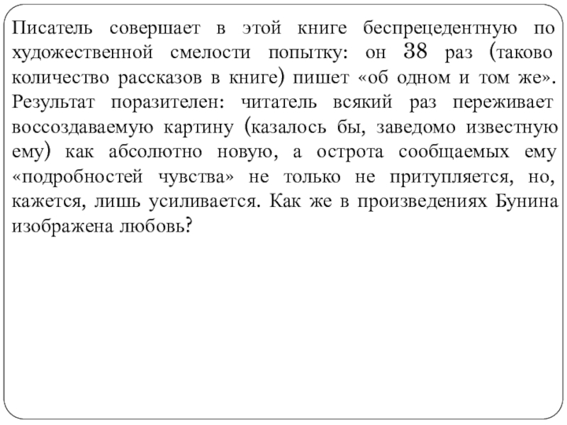 38 раз (таково количество рассказов в книге) пишет «об одном и том же». Результат поразителен: читатель всякий раз переживает воссоздаваемую картину (казалось бы, заведомо известную ему) как абсолютно новую, а острота сообщаемых ему «подробностей чувства» не только не притупляется, но, кажется, лишь усиливается. Как же в произведениях Бунина изображена любовь?