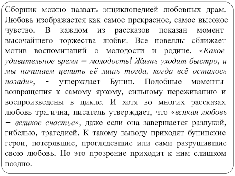 самое высокое чувство. В каждом из рассказов показан момент высочайшего торжества любви. Все новеллы сближает мотив воспоминаний о молодости и родине. «Какое удивительное время – молодость! Жизнь уходит быстро, и мы начинаем ценить её лишь тогда, когда всё осталось позади», - утверждает Бунин. Подобные моменты возвращения к самому яркому, сильному переживанию и воспроизведены в цикле. И хотя во многих рассказах любовь трагична, писатель утверждает, что «всякая любовь – великое счастье», даже если она завершается разлукой, гибелью, трагедией. К такому выводу приходят бунинские герои, потерявшие, проглядевшие или сами разрушившие свою любовь. Но это прозрение приходит к ним слишком поздно.