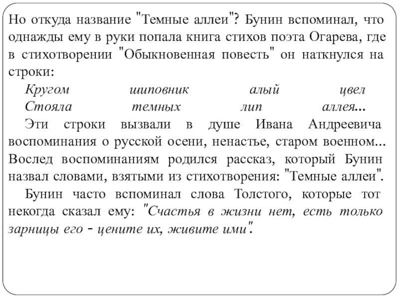 Слайд 6Но откуда название "Темные аллеи"? Бунин вспоминал, что однажды ему в