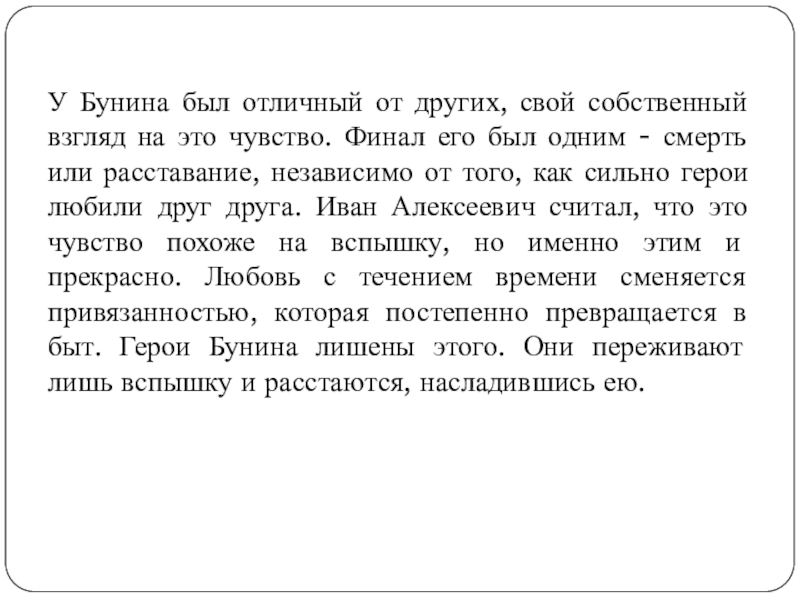 чувство. Финал его был одним - смерть или расставание, независимо от того, как сильно герои любили друг друга. Иван Алексеевич считал, что это чувство похоже на вспышку, но именно этим и прекрасно. Любовь с течением времени сменяется привязанностью, которая постепенно превращается в быт. Герои Бунина лишены этого. Они переживают лишь вспышку и расстаются, насладившись ею.