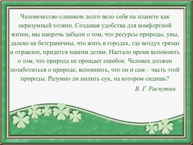 Слайд 3Человечество слишком долго вело себя на планете как неразумный хозяин. Создавая