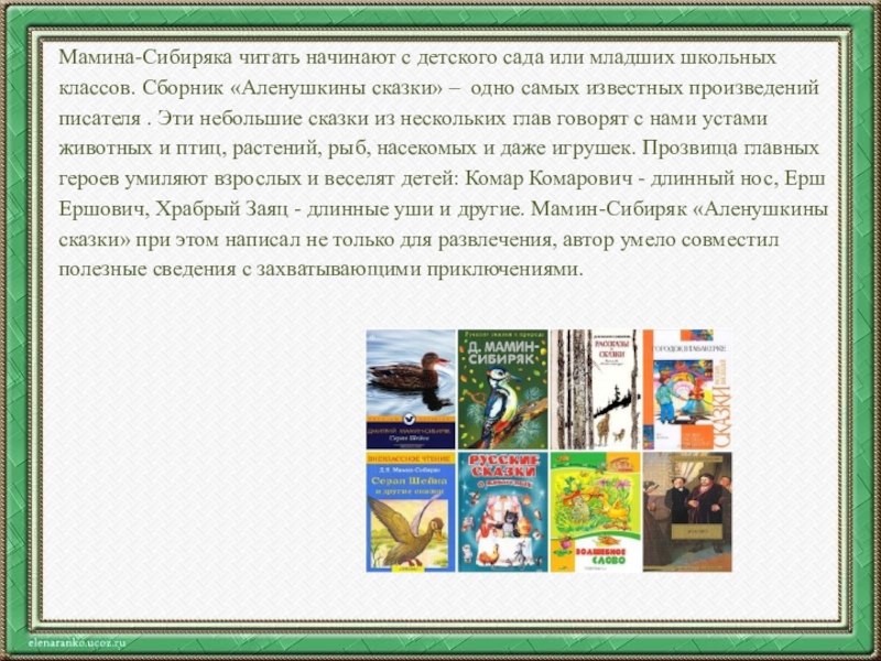 Слайд 10Мамина-Сибиряка читать начинают с детского сада или младших школьных классов. Сборник