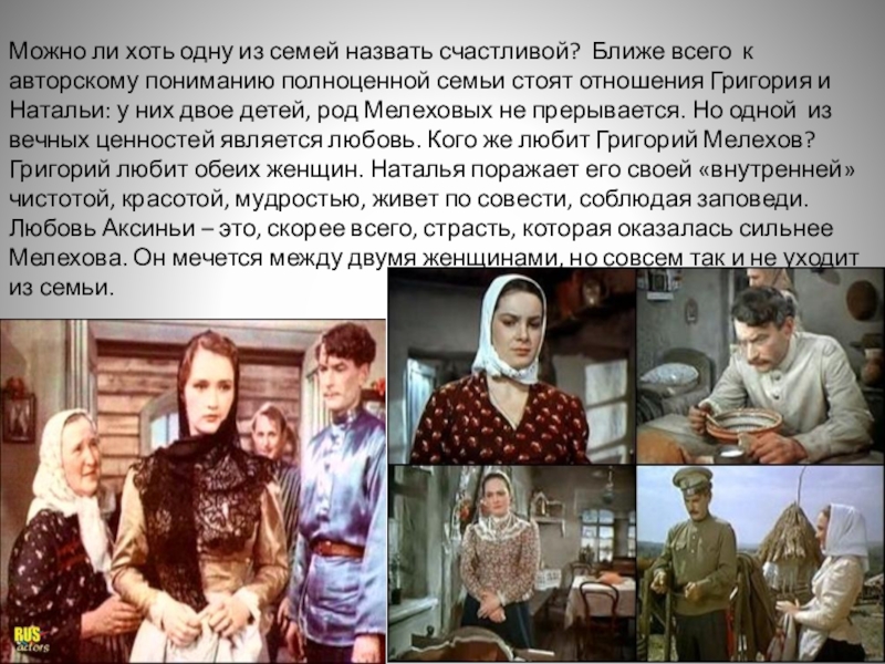 авторскому пониманию полноценной семьи стоят отношения Григория и Натальи: у них двое детей, род Мелеховых не прерывается. Но одной из вечных ценностей является любовь. Кого же любит Григорий Мелехов? Григорий любит обеих женщин. Наталья поражает его своей «внутренней» чистотой, красотой, мудростью, живет по совести, соблюдая заповеди. Любовь Аксиньи – это, скорее всего, страсть, которая оказалась сильнее Мелехова. Он мечется между двумя женщинами, но совсем так и не уходит из семьи.
