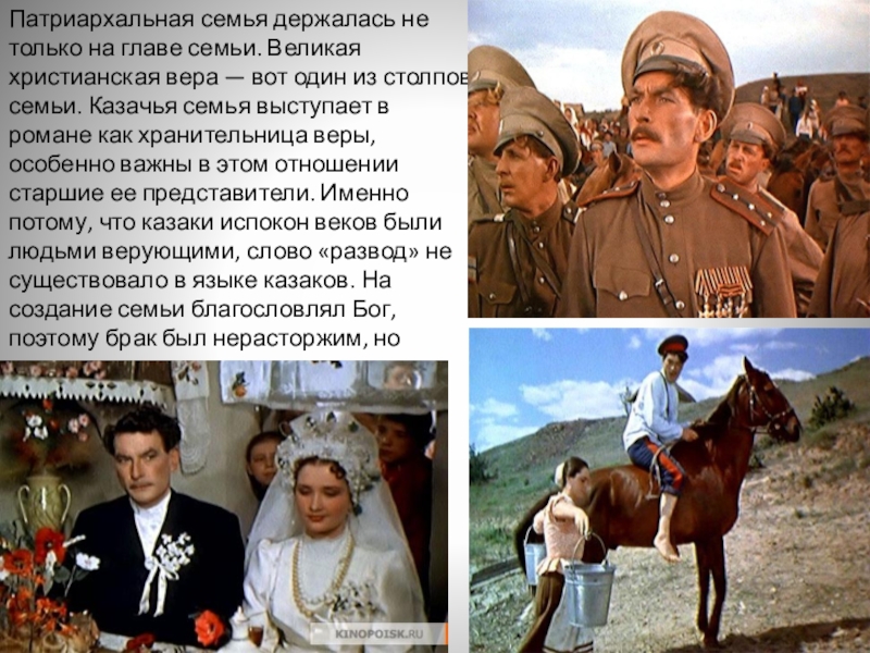 — вот один из столпов семьи. Казачья семья выступает в романе как хранительница веры, особенно важны в этом отношении старшие ее представители. Именно потому, что казаки испокон веков были людьми верующими, слово «развод» не существовало в языке казаков. На создание семьи благословлял Бог, поэтому брак был нерасторжим, но поскольку заключали его люди, неколебимым он не мог быть.
