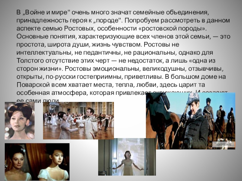 Слайд 4В „Войне и мире" очень много значат семейные объединения, принадлежность героя