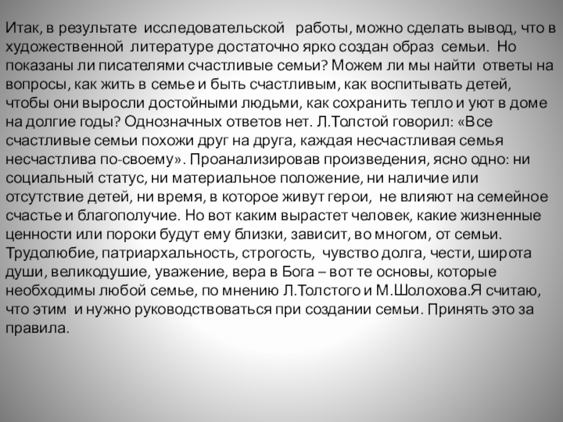 художественной литературе достаточно ярко создан образ семьи. Но показаны ли писателями счастливые семьи? Можем ли мы найти ответы на вопросы, как жить в семье и быть счастливым, как воспитывать детей, чтобы они выросли достойными людьми, как сохранить тепло и уют в доме на долгие годы? Однозначных ответов нет. Л.Толстой говорил: «Все счастливые семьи похожи друг на друга, каждая несчастливая семья несчастлива по-своему». Проанализировав произведения, ясно одно: ни социальный статус, ни материальное положение, ни наличие или отсутствие детей, ни время, в которое живут герои, не влияют на семейное счастье и благополучие. Но вот каким вырастет человек, какие жизненные ценности или пороки будут ему близки, зависит, во многом, от семьи. Трудолюбие, патриархальность, строгость, чувство долга, чести, широта души, великодушие, уважение, вера в Бога – вот те основы, которые необходимы любой семье, по мнению Л.Толстого и М.Шолохова.Я считаю, что этим и нужно руководствоваться при создании семьи. Принять это за правила.