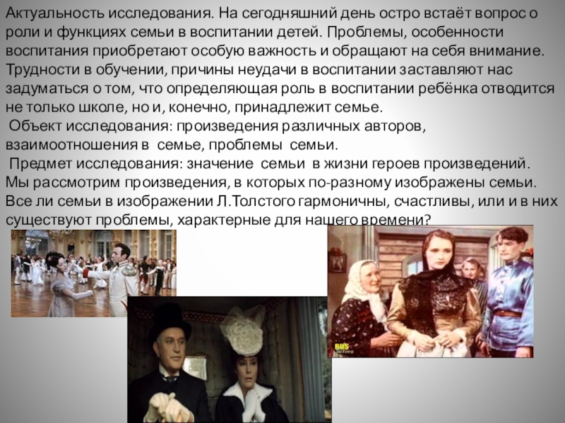Мы рассмотрим произведения, в которых по-разному изображены семьи. Все ли семьи в изображении Л.Толстого гармоничны, счастливы, или и в них существуют проблемы, характерные для нашего времени?