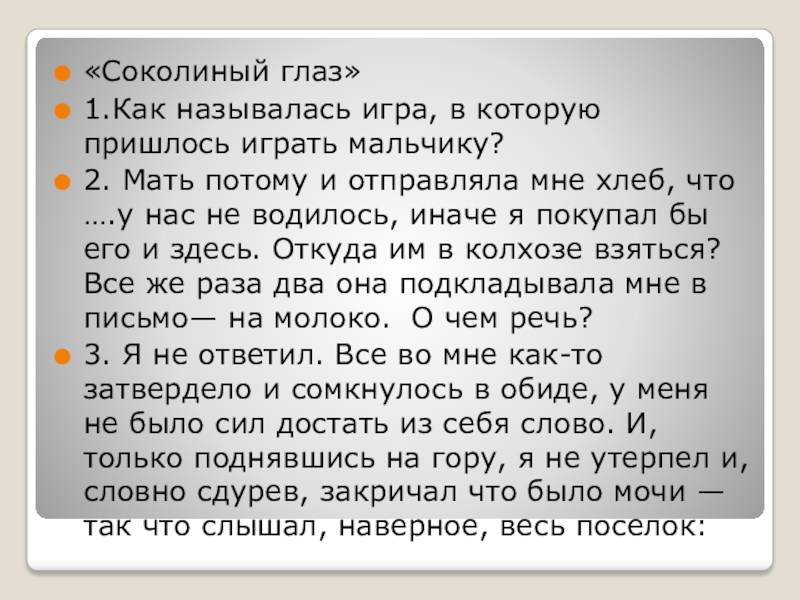 «Соколиный глаз»1.Как называлась игра, в которую пришлось играть мальчику?2. Мать потому и отправляла мне хлеб, что ….у