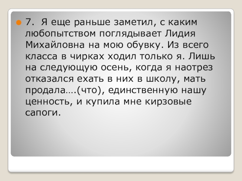 7.  Я еще раньше заметил, с каким любопытством поглядывает Лидия Михайловна на мою обувку. Из всего класса