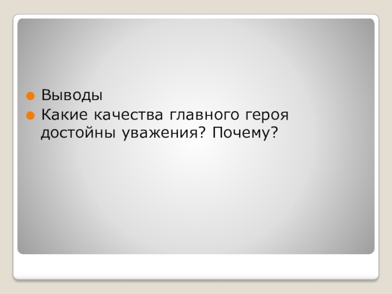 ВыводыКакие качества главного героя достойны уважения? Почему?