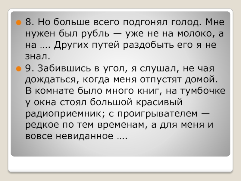 Слайд 58. Но больше всего подгонял голод. Мне нужен был рубль —