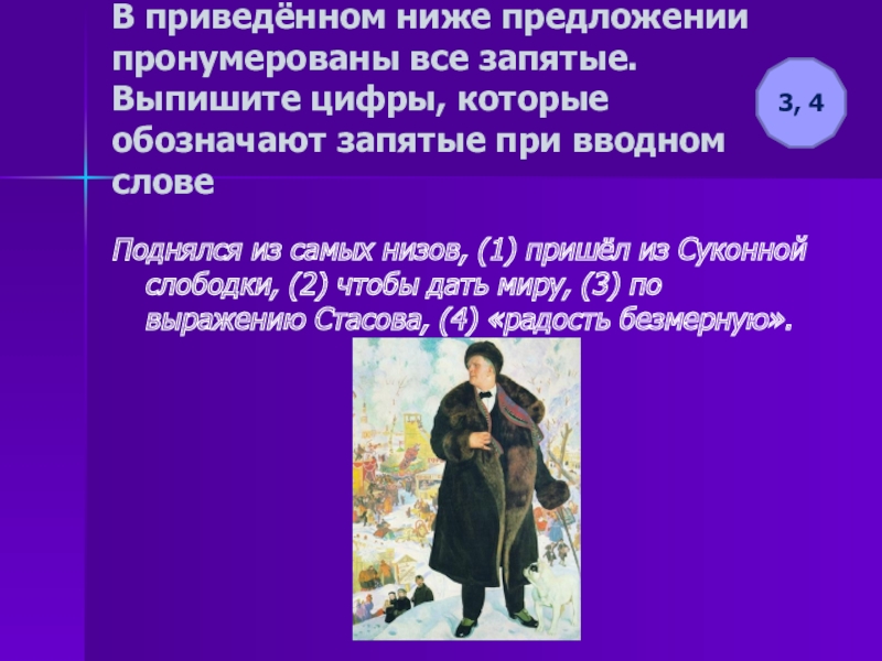 Поднялся из самых низов, (1) пришёл из Суконной слободки, (2) чтобы дать миру, (3) по выражению Стасова, (4) «радость безмерную».