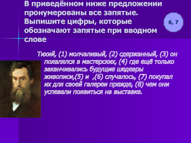 Тихий, (1) молчаливый, (2) сдержанный, (3) он появлялся в мастерских, (4) где ещё только заканчивались будущие шедевры живописи,(5) и ,(6) случалось, (7) покупал их для своей галереи прежде, (8) чем они успевали появиться на выставке.