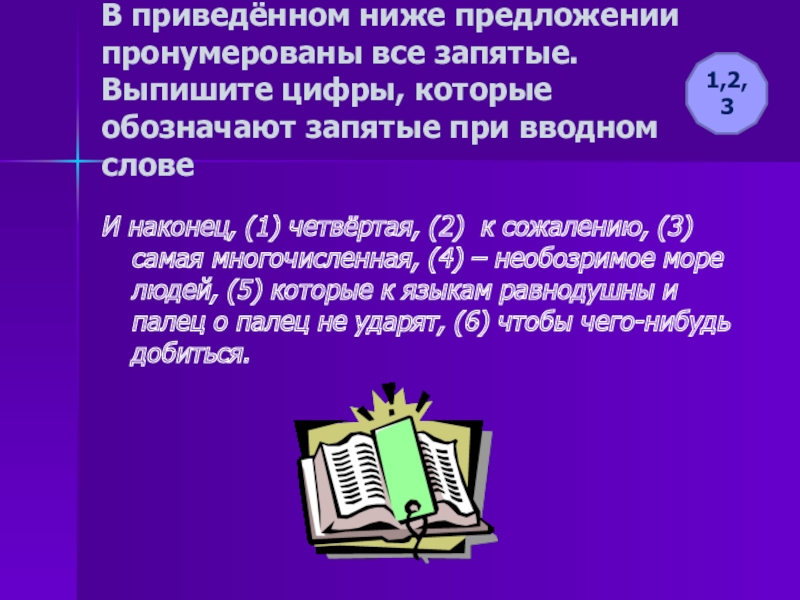 И наконец, (1) четвёртая, (2) к сожалению, (3) самая многочисленная, (4) – необозримое море людей, (5) которые к языкам равнодушны и палец о палец не ударят, (6) чтобы чего-нибудь добиться.