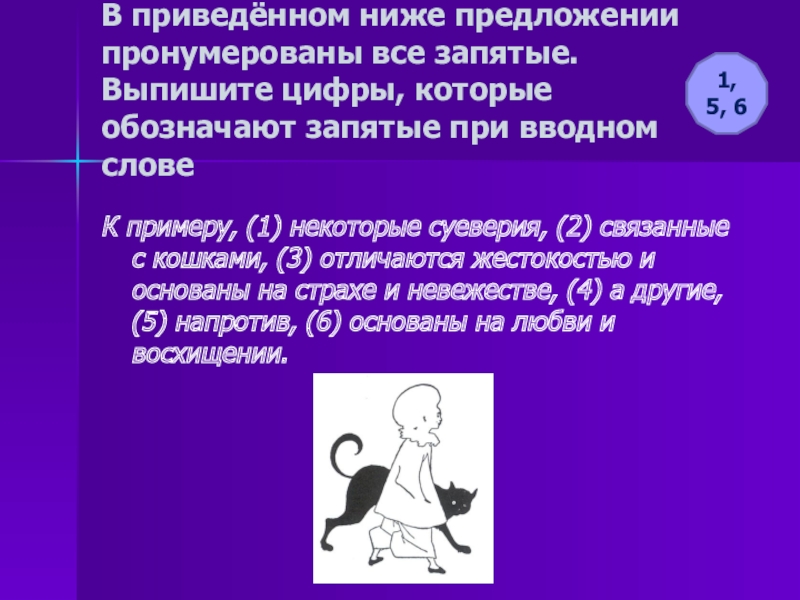 К примеру, (1) некоторые суеверия, (2) связанные с кошками, (3) отличаются жестокостью и основаны на страхе и невежестве, (4) а другие, (5) напротив, (6) основаны на любви и восхищении.