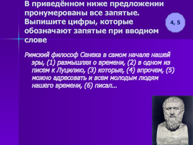 Римский философ Сенека в самом начале нашей эры, (1) размышляя о времени, (2) в одном из писем к Луцилию, (3) которые, (4) впрочем, (5) можно адресовать и всем молодым людям нашего времени, (6) писал…