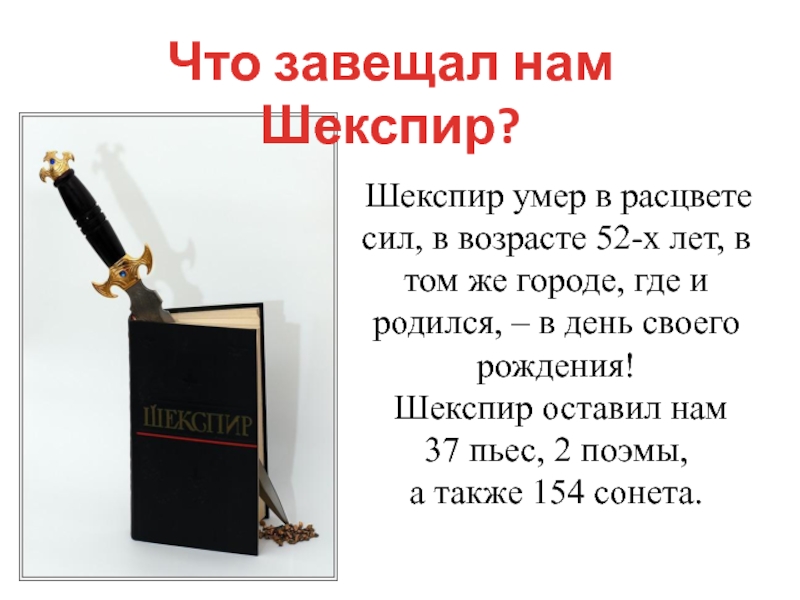 Что завещал нам Шекспир? Шекспир умер в расцвете сил, в возрасте 52-х лет, в том же городе,