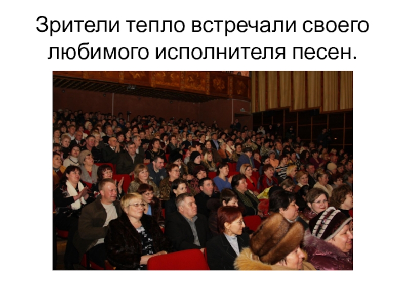 Слайд 12Зрители тепло встречали своего любимого исполнителя песен.