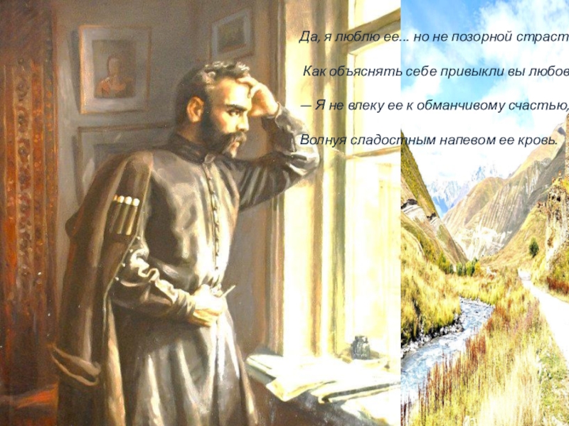 Да, я люблю ее... но не позорной страстью, Как объяснять себе привыкли вы любовь, — Я не влеку ее к обманчивому счастью, Волнуя сладостным напевом ее кровь.