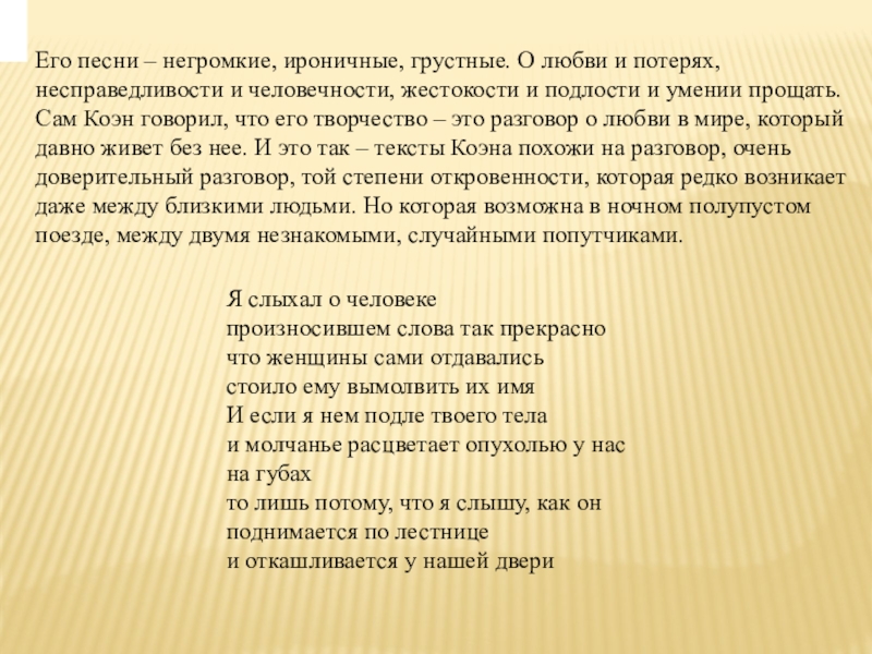 и человечности, жестокости и подлости и умении прощать. Сам Коэн говорил, что его творчество – это разговор о любви в мире, который давно живет без нее. И это так – тексты Коэна похожи на разговор, очень доверительный разговор, той степени откровенности, которая редко возникает даже между близкими людьми. Но которая возможна в ночном полупустом поезде, между двумя незнакомыми, случайными попутчиками.