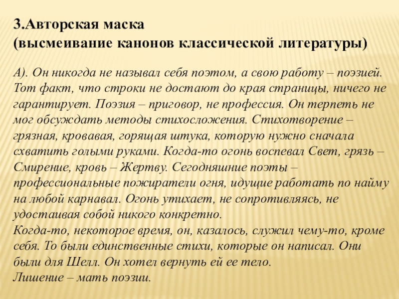 А). Он никогда не называл себя поэтом, а свою работу – поэзией. Тот факт, что строки не достают до края страницы, ничего не гарантирует. Поэзия – приговор, не профессия. Он терпеть не мог обсуждать методы стихосложения. Стихотворение – грязная, кровавая, горящая штука, которую нужно сначала схватить голыми руками. Когда-то огонь воспевал Свет, грязь – Смирение, кровь – Жертву. Сегодняшние поэты – профессиональные пожиратели огня, идущие работать по найму на любой карнавал. Огонь утихает, не сопротивляясь, не удостаивая собой никого конкретно.