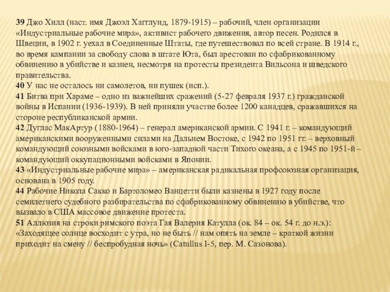 44 Рабочие Никола Сакко и Бартоломео Ванцетти были казнены в 1927 году после семилетнего судебного разбирательства по сфабрикованному обвинению в убийстве, что вызвало в США массовое движение протеста.
