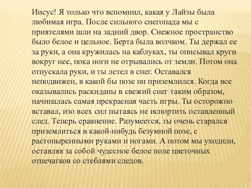 После сильного снегопада мы с приятелями шли на задний двор. Снежное пространство было белое и цельное. Берта была волчком. Ты держал ее за руки, а она кружилась на каблуках, ты описывал круги вокруг нее, пока ноги не отрывались от земли. Потом она отпускала руки, и ты летел в снег. Оставался неподвижен, в какой бы позе ни приземлился. Когда все оказывались раскиданы в свежий снег таким образом, начиналась самая прекрасная часть игры. Ты осторожно вставал, изо всех сил пытаясь не испортить оставленный след. Теперь сравнение. Разумеется, ты очень старался приземлиться в какой-нибудь безумной позе, с растопыренными руками и ногами. А потом мы уходили, оставляя за собой чудесное белое поле цветочных отпечатков со стеблями следов.