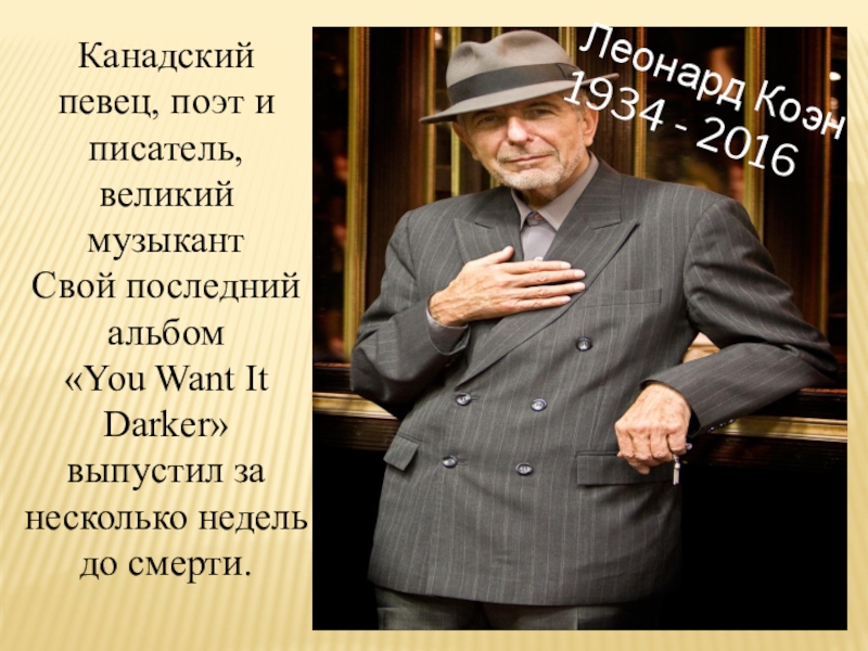Слайд 1Канадский певец, поэт и писатель, великий музыкант
