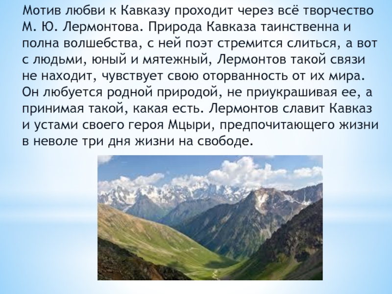 Ю. Лермонтова. Природа Кавказа таинственна и полна волшебства, с ней поэт стремится слиться, а вот с людьми, юный и мятежный, Лермонтов такой связи не находит, чувствует свою оторванность от их мира. Он любуется родной природой, не приукрашивая ее, а принимая такой, какая есть. Лермонтов славит Кавказ и устами своего героя Мцыри, предпочитающего жизни в неволе три дня жизни на свободе.