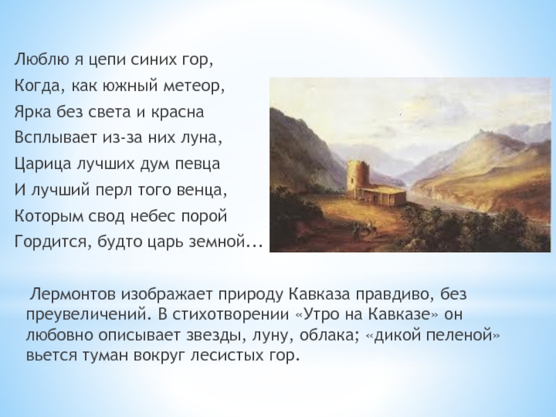 Лермонтов изображает природу Кавказа правдиво, без преувеличений. В стихотворении «Утро на Кавказе» он любовно описывает звезды, луну, облака; «дикой пеленой» вьется туман вокруг лесистых гор.