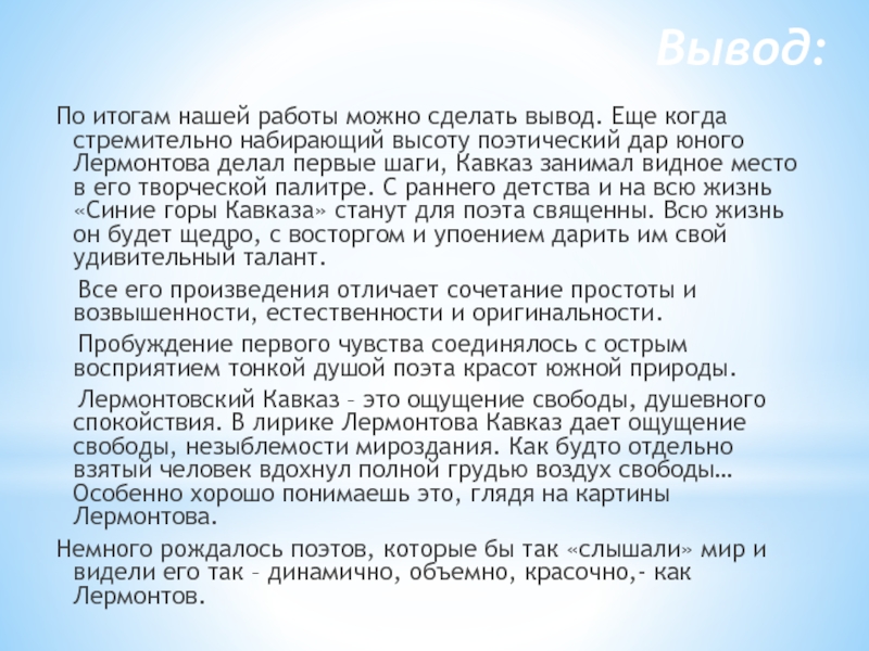 Лермонтовский Кавказ – это ощущение свободы, душевного спокойствия. В лирике Лермонтова Кавказ дает ощущение свободы, незыблемости мироздания. Как будто отдельно взятый человек вдохнул полной грудью воздух свободы… Особенно хорошо понимаешь это, глядя на картины Лермонтова.