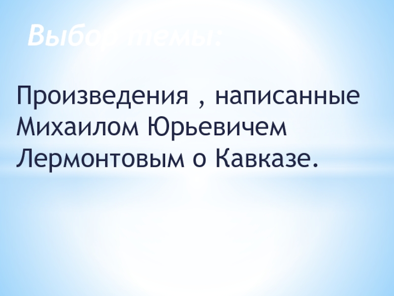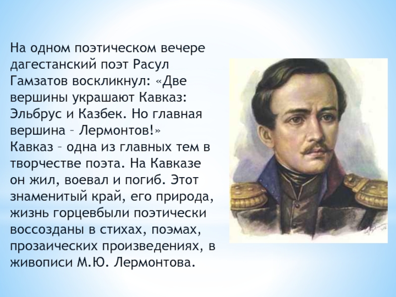 Кавказ – одна из главных тем в творчестве поэта. На Кавказе он жил, воевал и погиб. Этот знаменитый край, его природа, жизнь горцевбыли поэтически воссозданы в стихах, поэмах, прозаических произведениях, в живописи М.Ю. Лермонтова.