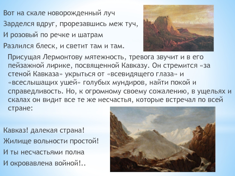 Присущая Лермонтову мятежность, тревога звучит и в его пейзажной лирике, посвященной Кавказу. Он стремится «за стеной Кавказа» укрыться от «всевидящего глаза» и «всеслышащих ушей» голубых мундиров, найти покой и справедливость. Но, к огромному своему сожалению, в ущельях и скалах он видит все те же несчастья, которые встречал по всей стране: