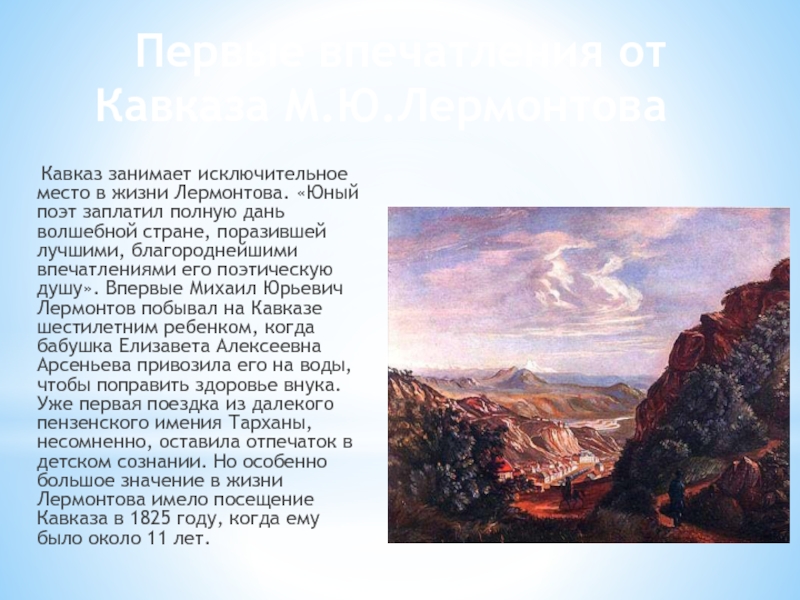 в жизни Лермонтова. «Юный поэт заплатил полную дань волшебной стране, поразившей лучшими, благороднейшими впечатлениями его поэтическую душу». Впервые Михаил Юрьевич Лермонтов побывал на Кавказе шестилетним ребенком, когда бабушка Елизавета Алексеевна Арсеньева привозила его на воды, чтобы поправить здоровье внука. Уже первая поездка из далекого пензенского имения Тарханы, несомненно, оставила отпечаток в детском сознании. Но особенно большое значение в жизни Лермонтова имело посещение Кавказа в 1825 году, когда ему было около 11 лет.