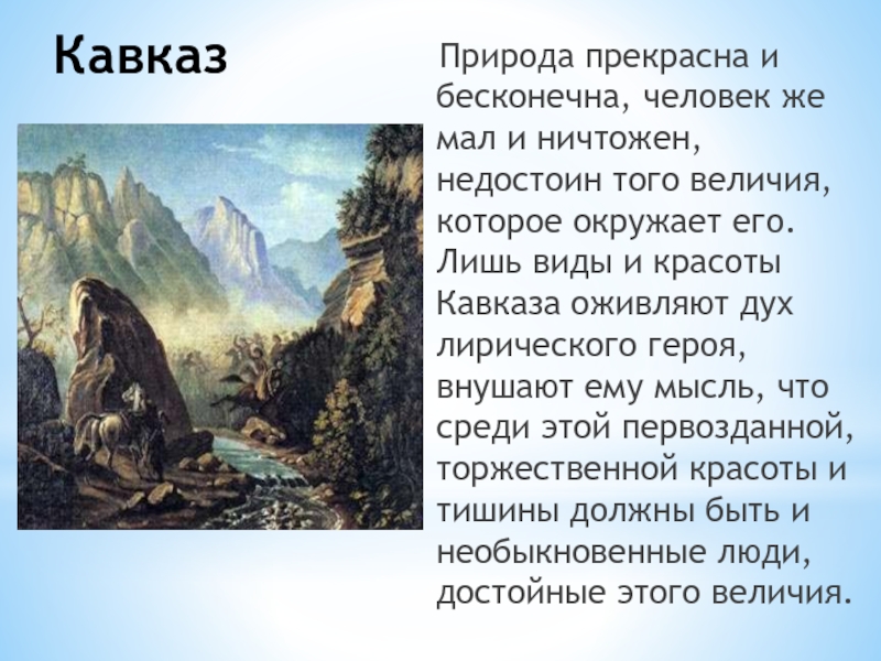 того величия, которое окружает его. Лишь виды и красоты Кавказа оживляют дух лирического героя, внушают ему мысль, что среди этой первозданной, торжественной красоты и тишины должны быть и необыкновенные люди, достойные этого величия.