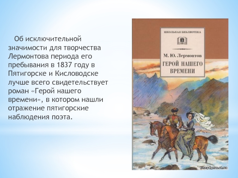пребывания в 1837 году в Пятигорске и Кисловодске лучше всего свидетельствует роман «Герой нашего времени», в котором нашли отражение пятигорские наблюдения поэта.