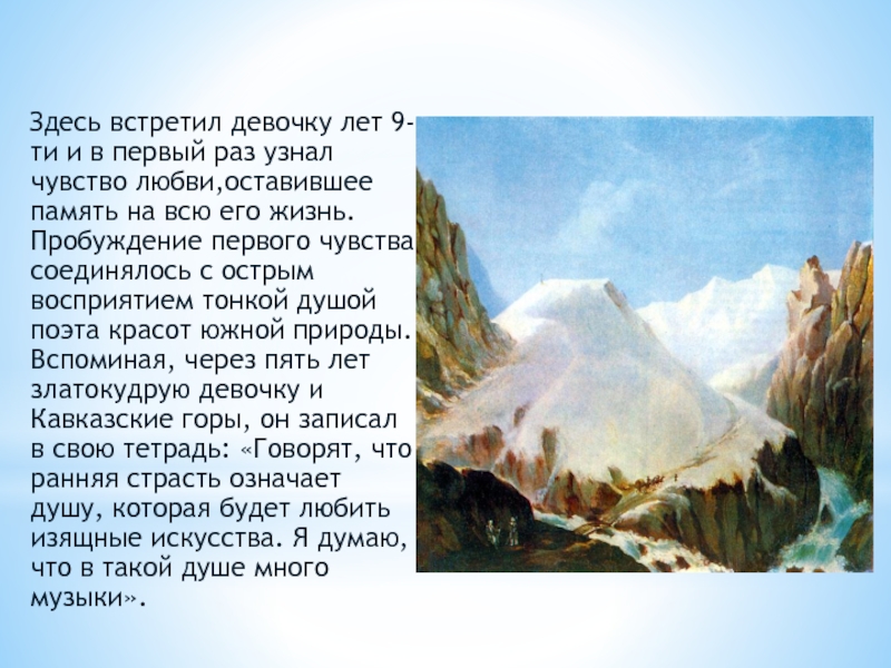 чувство любви,оставившее память на всю его жизнь. Пробуждение первого чувства соединялось с острым восприятием тонкой душой поэта красот южной природы. Вспоминая, через пять лет златокудрую девочку и Кавказские горы, он записал в свою тетрадь: «Говорят, что ранняя страсть означает душу, которая будет любить изящные искусства. Я думаю, что в такой душе много музыки».